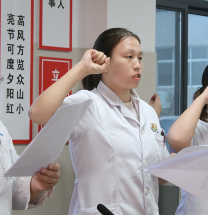 接下来由讲师代表韩晓静带领全体人员宣誓,“我志愿献身人类的健康事业;自觉维护医学的尊严和神圣;敬佑生命,救死扶伤,平等仁爱,尊师重道;诚实守信,恪守医德,精益求精,慎思笃行;以上誓言,源于心,践于行。”一声声的誓言铿锵有力,在会场里激荡回响,成了即将开启的执业生涯最庄重的印记。