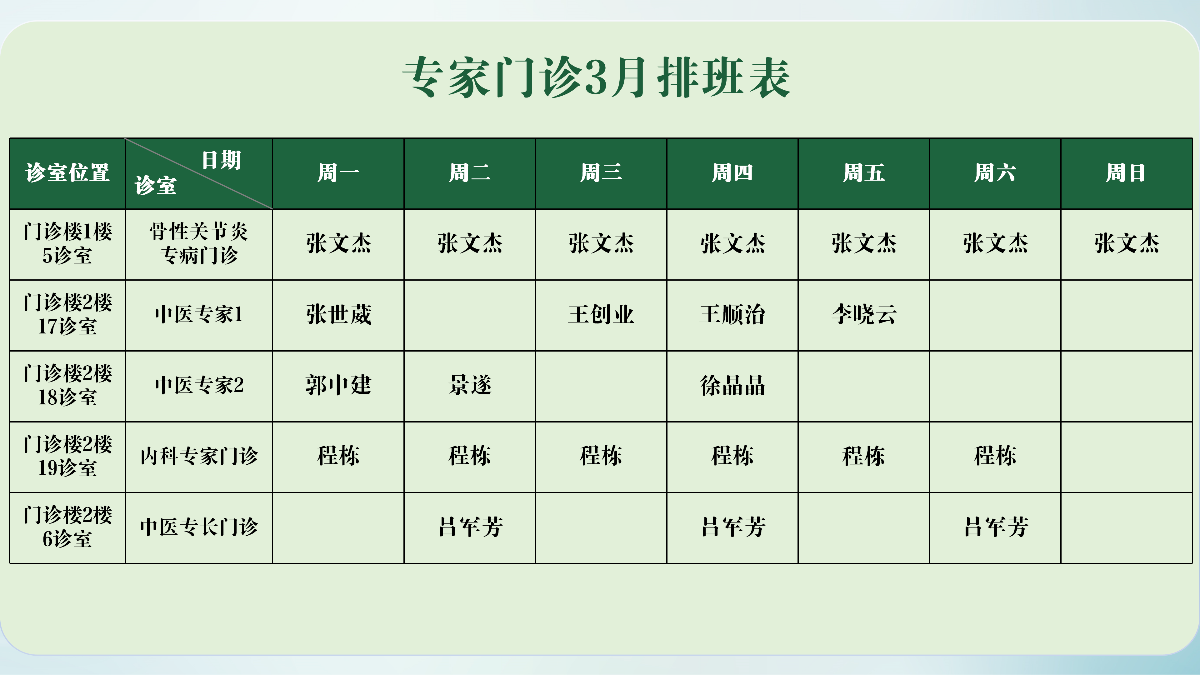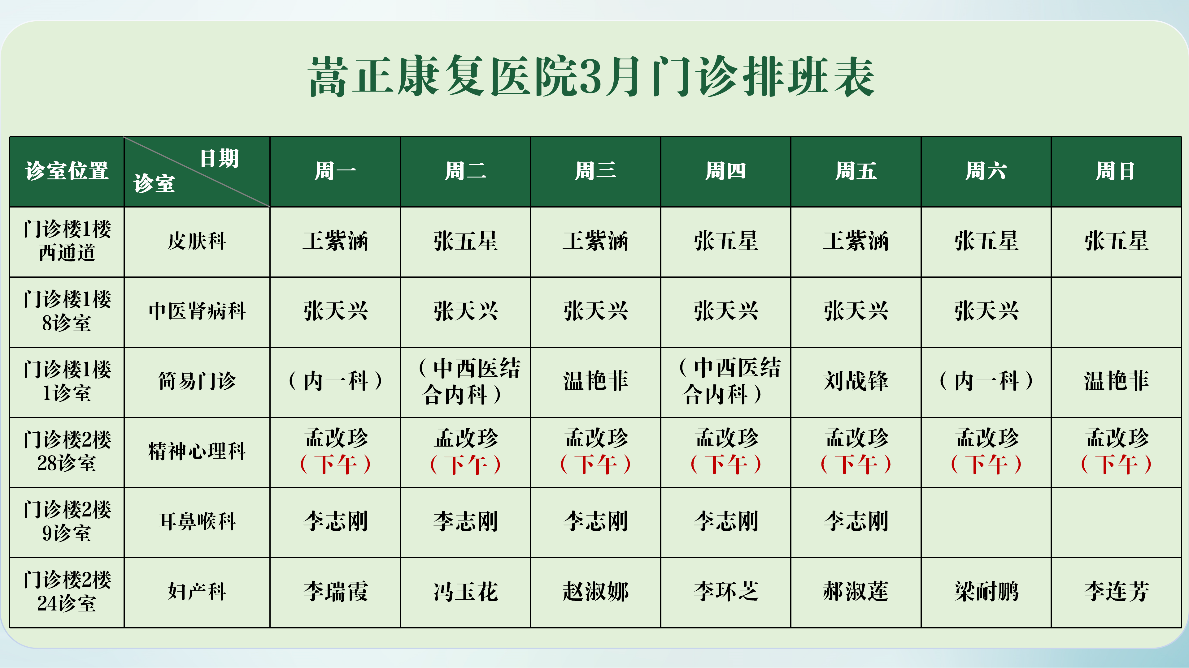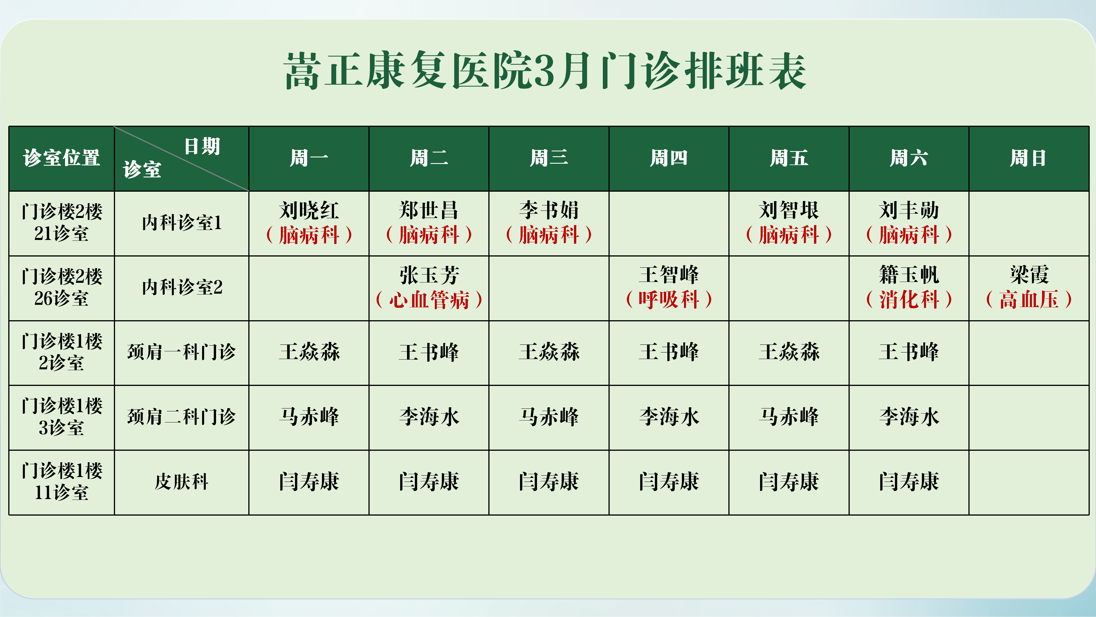 嵩正康复医院2026年3月门诊排班表
